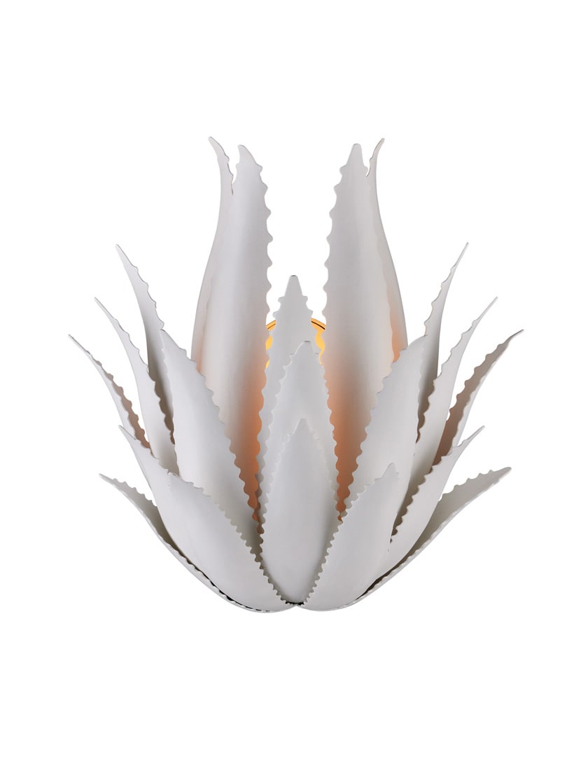 The Agave Wall Sconce was inspired by the flourishing plant of the same name, whose spiky, leathery fronds curl up from the ground. This sense of movement has been captured in the flowing spikes on this wrought iron creation covered in a crisp gesso white finish.