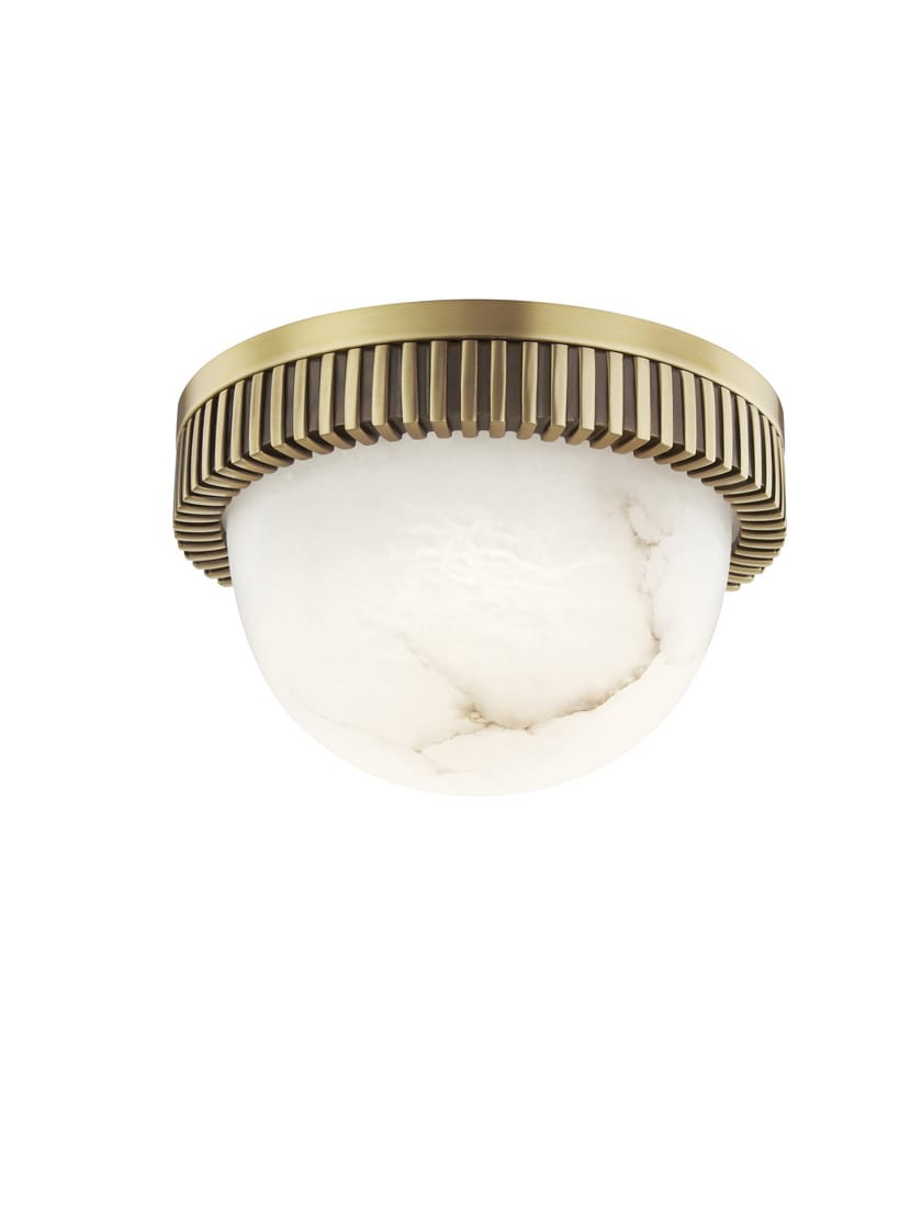 With its ridged canopy and natural stone diffuser, Ainsley is a glamorous flush mount. The unique veining of its diffuser and slightly Deco vibes of its mount suggest a sense of luxury. Complete with an aged brass finish for an elegant look.
