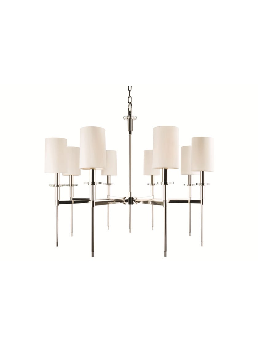 The 8 light Amherst chandelier's elongated torch handles shun needless complexity, resulting in smooth sophistication. It's crystal accents and gleaming nickel finish give it a 21st-century twist. White fabric shades top the tall tapers, complementing the cylindrical shape of its crystal bobeches.