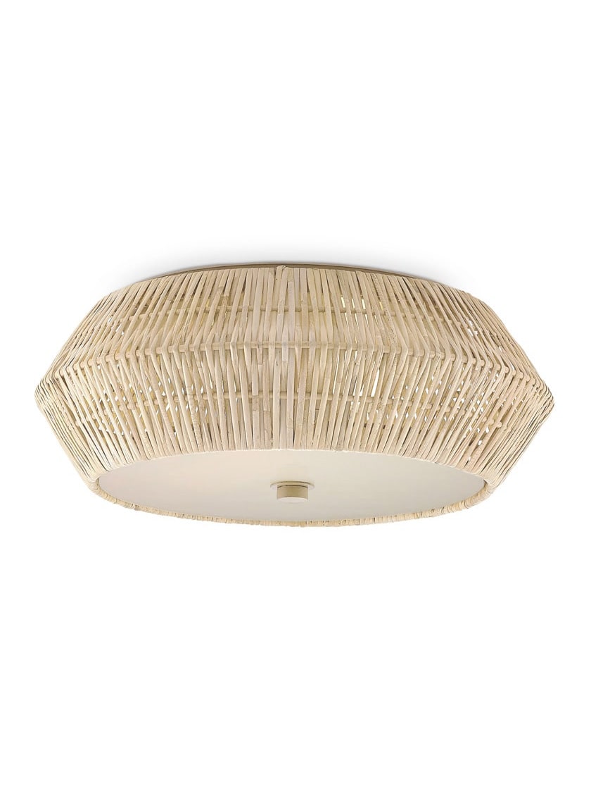 Painstakingly woven by artisans who use traditional techniques, the Antibes Flush Mount is a marriage of artistry and high-quality construction. Woven rattan forms the outer ring of a geometric cage fitted with an art glass diffuser to create this fashionable ceiling light. Choose from natural or bleached white color.