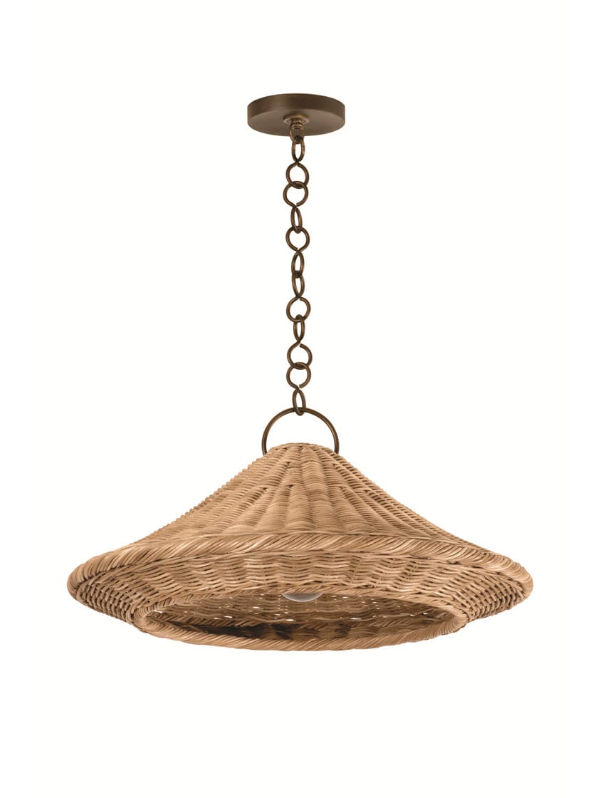 Inspired by the tranquility of the sea, the handwoven Baychester pendant provides ambient illumination day and night. Combining rustic materials, a conical rattan shade is suspended from a large Bronze Leaf loop and chain. Serving as a powerful downlight, it brims with contemporary character and functionality.