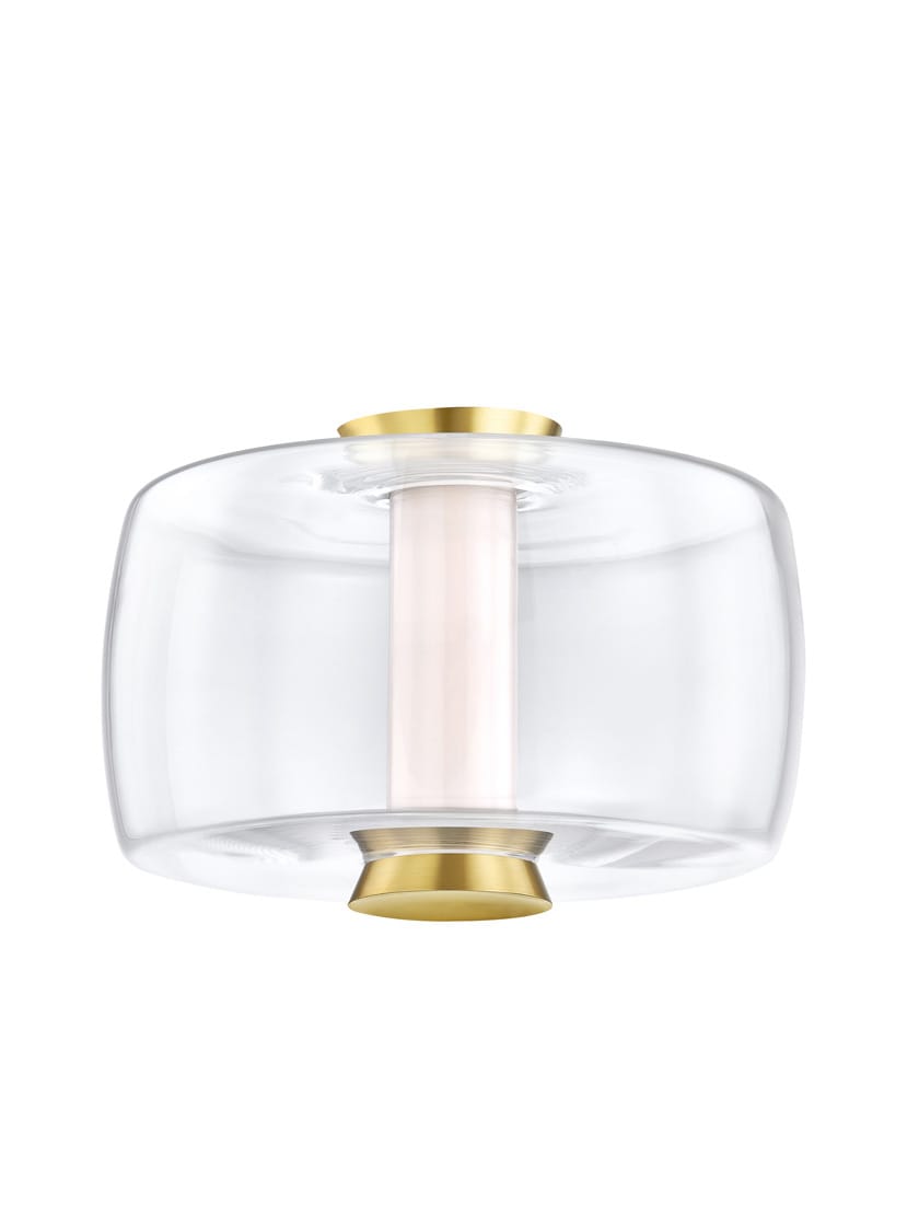The Beau flush mount resembles a fragile bubble, suspended with poetic beauty. The ethereal, precious nature of the clear glass shade is seemingly held together by its matching canopy and cap in bold Aged Brass. Illuminated by LED, this sleek and artful ceiling light is well-suited to contemporary interiors.