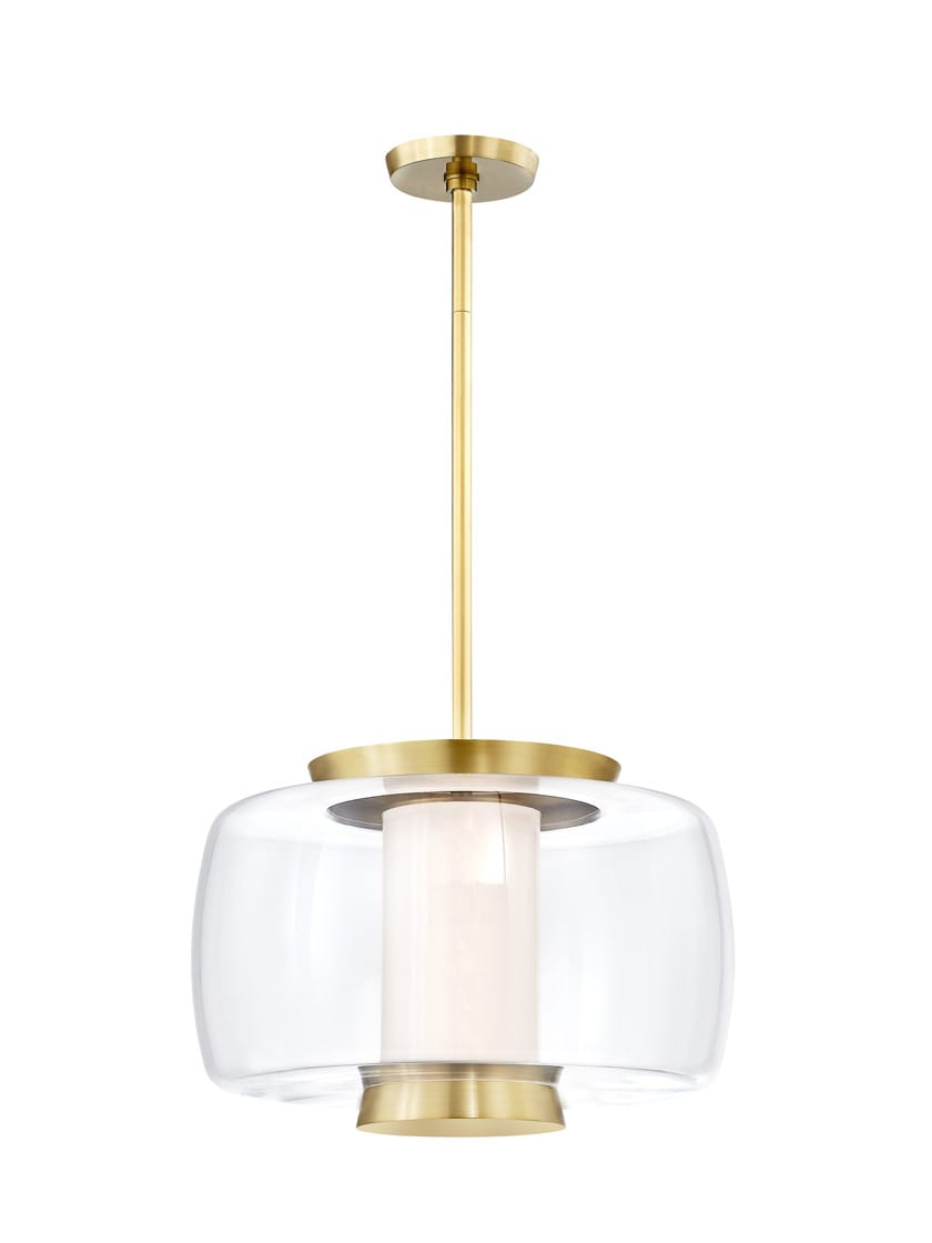 Hanging with poetic beauty over dining tables, countertops, and living spaces, our 20" Beau pendant resembles a fragile bubble suspended in air, . The ethereal, precious nature of the clear glass shade is balanced by a sleek, Aged Brass rod that supports the fixture. Illuminated by LED, this artful pendant is well-suited to contemporary interiors.