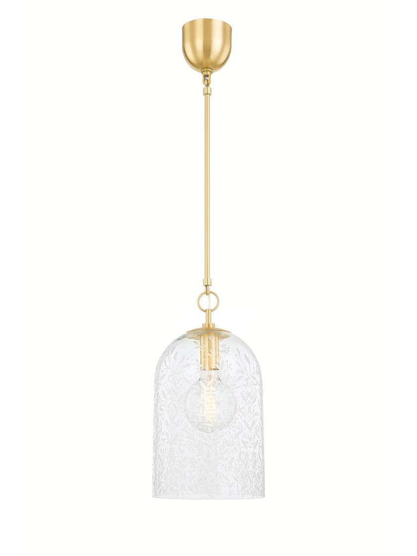 The simple silhouette of Belleville's 10" pendant becomes simply stunning with its intricate floral etching on the clear glass shade. This pretty pendant, hung singly or in groups, will fill the room with breathtaking reflections and shadows when lit. The two classic finishes provide versatility in lighting different types of spaces.