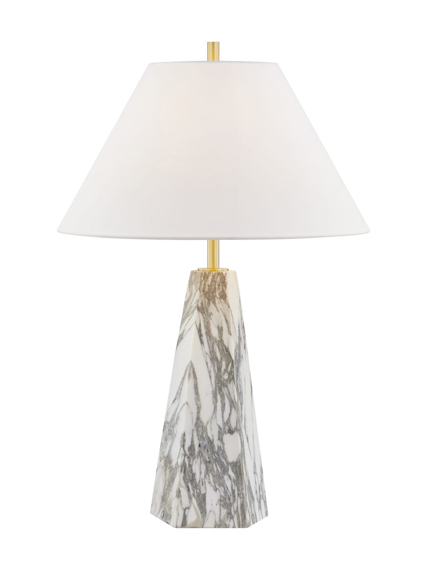 Featuring a pyramid-shaped base of honed Arabescato Corchia marble, the Benicia table lamp stands with a statuesque presence. Evoking a sense of permanence, the polished stone contrasts with the soft white linen of the shade. A slender Aged Brass neck adds the finishing touch, a contemporary update to a timeless beauty.