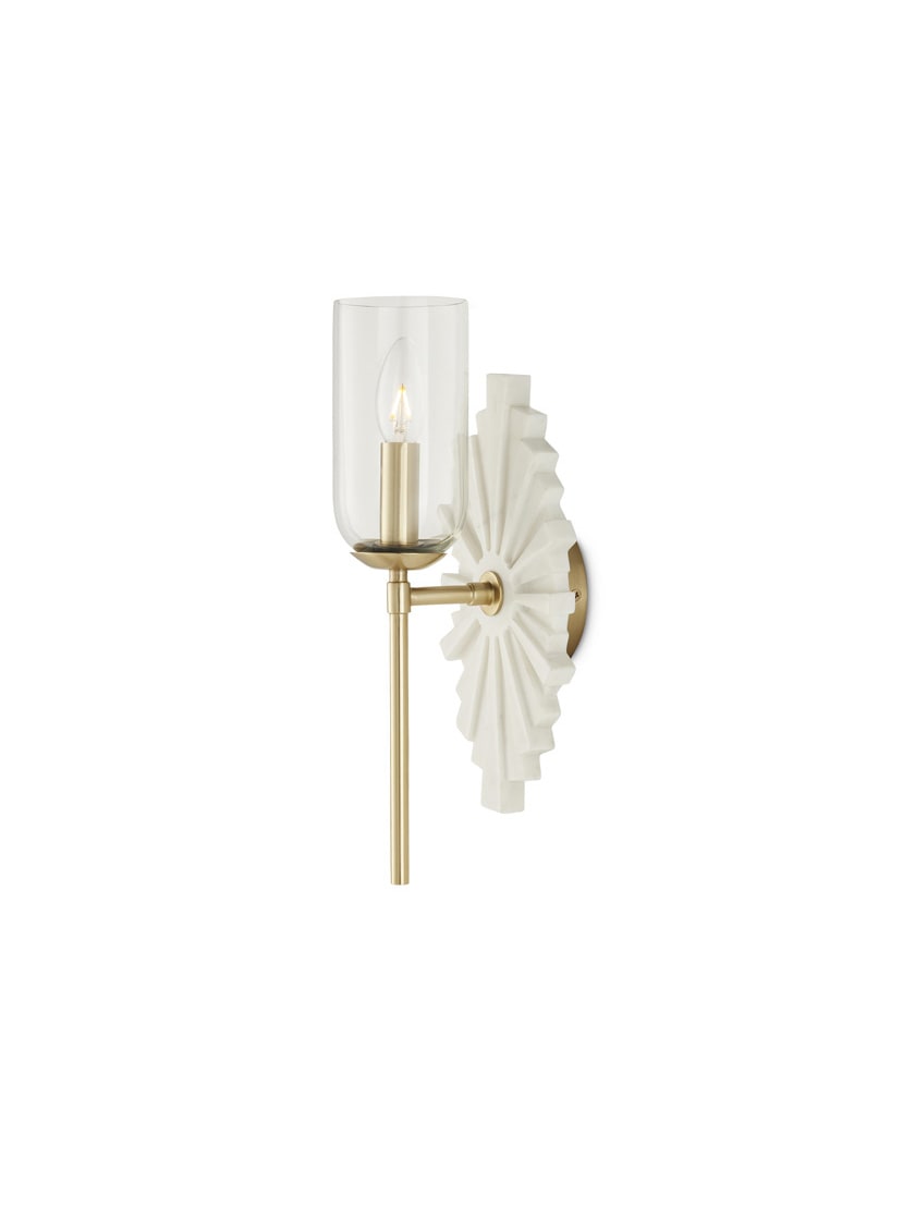 The Benthos 1 Light Wall Sconce features a striking starburst pattern on its wall plate. Crafted from marble and stainless steel with an elegant clear glass cup holding the light. Choose from two color combinations: Marquino black marble with natural veining that is accentuated by a nickel finish or crisp pale white marble that contrasts beautifully with its brass finish stem.