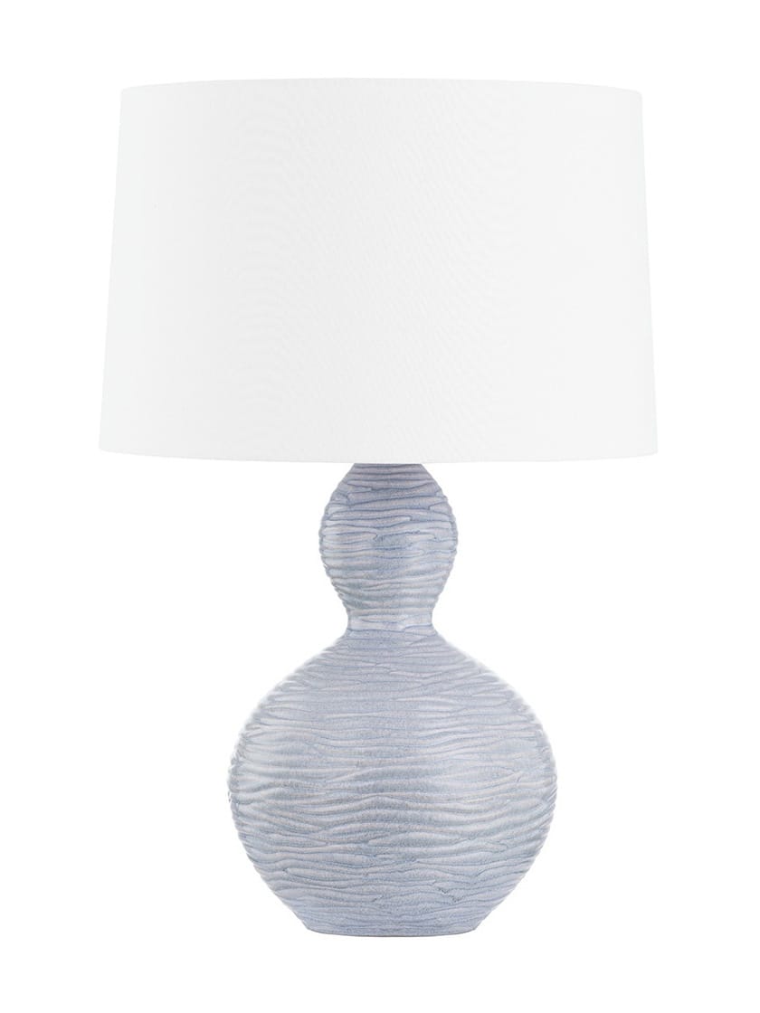 Cairns' organic bulbous shape, textured ceramic base, and white linen shade makes this table lamp a natural beauty. The Ceramic Coastal Blue finish is a reactive glaze, creating color and movement as light spills down the base.