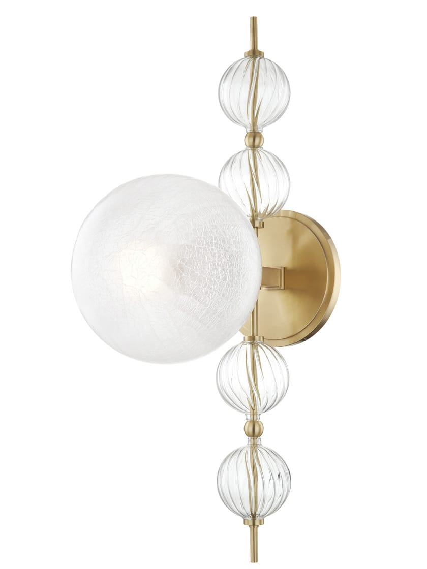Our Calypso sconce is whimsical and youthful, fresh and modern, bringing big top flair to the space it lights up. A maximalist aesthetic celebration of fun and geometry with fluted-spiral glass orbs and crackle-glass globe shade. A wow-factor fixture that will stand out in a room with more restrained design.
