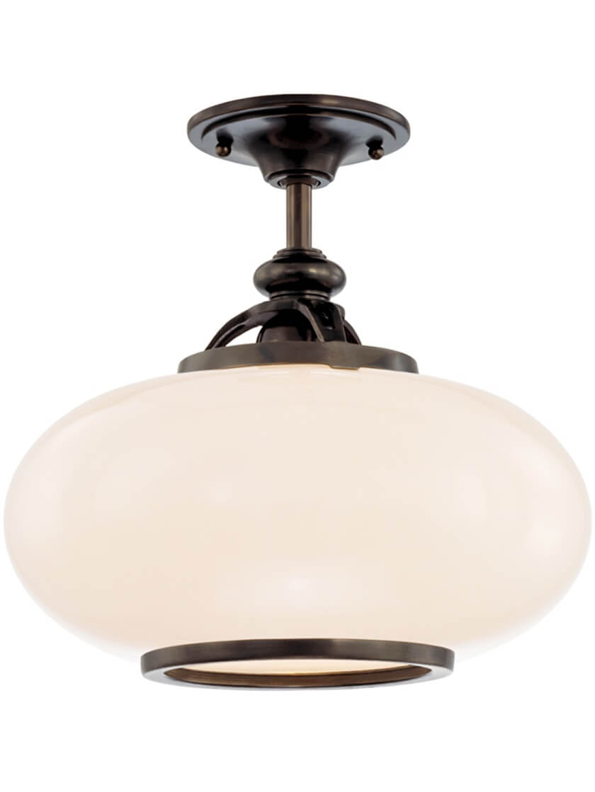 Exacting standards were necessary for constructing Gaslights which required airtight connections and durable glasswork. We apply these same rigorous design principles in the 21st century to our 15" Canton semi flush, resulting in a work of both solidity and sophistication. Canton’s pipe tubing hearkens to historical precedent, while cast metal rings at either end of the opal glass shade emphasize its oblong shape.
