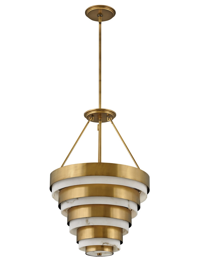 Breathing inspiration drawn from the classic style of Art Deco, our 4-light Echelon pendant, radiates with its gleaming Heritage Brass finish. Its Cloudstone glass rings, simulate glowing white marble, complimenting the brass rings perfectly as they overlap, tapering from top to bottom.