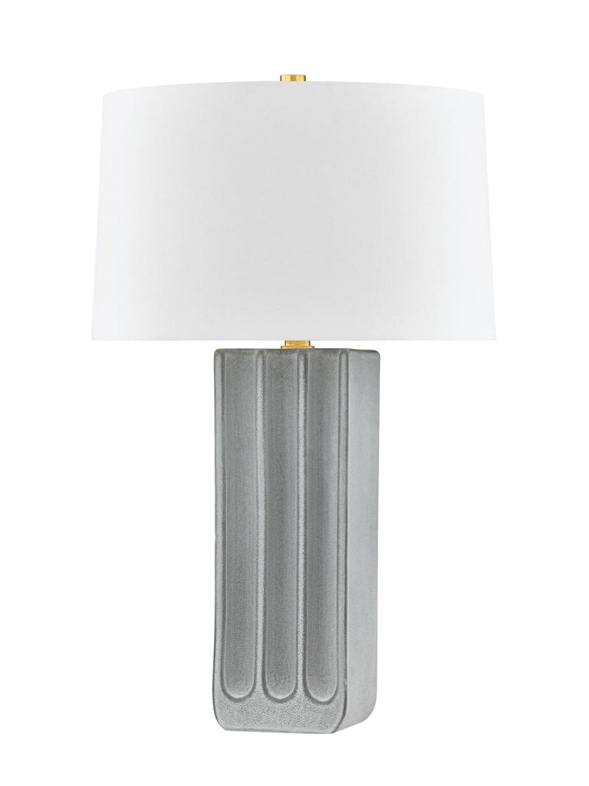 Referencing ancient Greek and Roman architecture, this modern table lamp features a distinctive scallop at the bottom and open flutes at the top. The reactive glaze accentuates the contrast as light washes over the smooth surface. A large linen drum shade balances the silhouette's proportions. Aged Brass metalwork glimmers at the neck and finial, completing the classical aesthetics of Elmer.