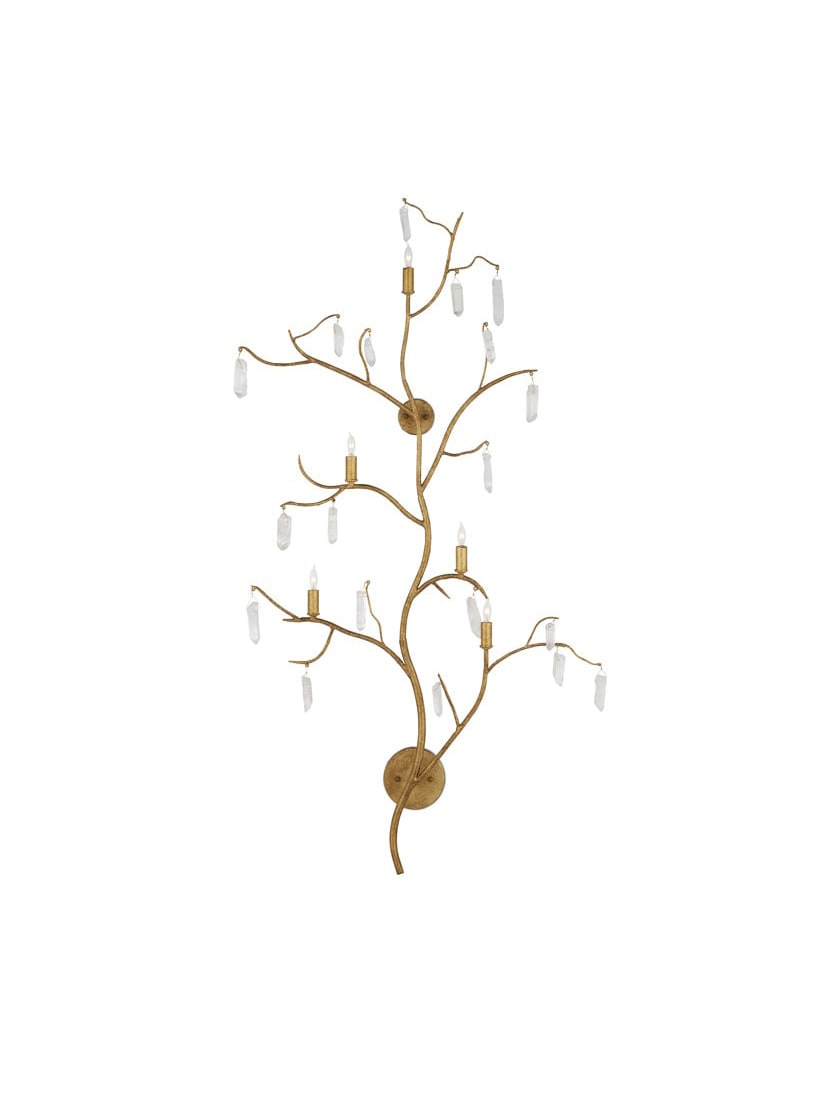 Dripping with quartz crystals and impressively scaled at almost 5 ft high, the Forest Light Wall Sconce is as much an exceptional work of art as it is a light fixture. The beautiful washed Lucerne gold finish is a perfect complement to the quartz on this amazing sculptural wall sconce that echoes nature with its tree-like branches.