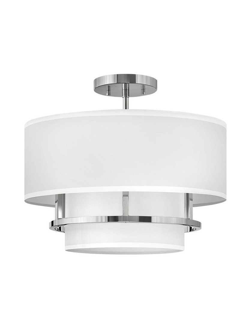 The Graham medium semi-flush mount is understated elegance, crafted with unique details making it the ultimate transitional lighting fixture. Its welded frame is nestled between two off-white shades, in luminous faux parchment with a finished cluster visible from below.