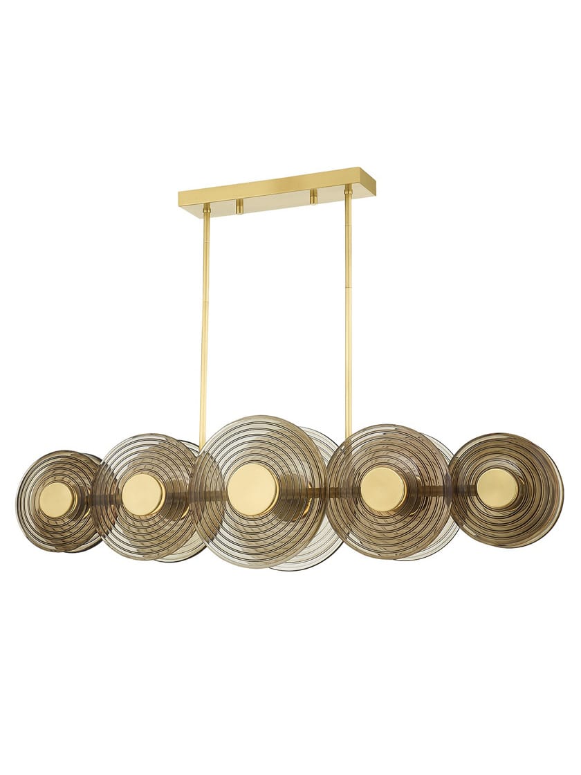 Our Griston 10 light linear chandelier, with discs of ribbed clear smoke glass capped in Aged Brass, takes cues from rippling waves and creates a glamourous retro aesthetic. Casting a warm, golden glow when lit, this vintage-inspired design delivers just the right amount of sparkle.