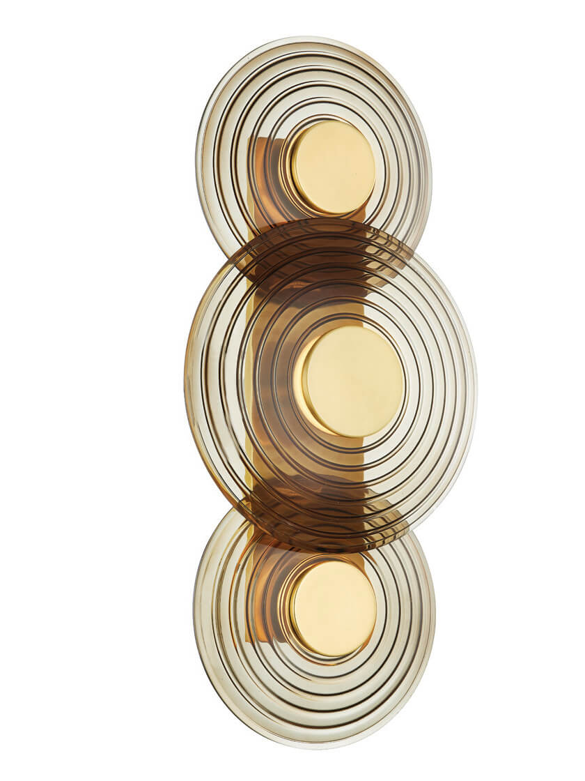 Discs of ribbed clear smoke glass capped in Aged Brass take cues from rippling waves to create the glamourous retro aesthetic of the Griston 3 light sconce. When lit, this vintage-inspired design casts a warm, golden glow, delivering just the right amount of sparkle.