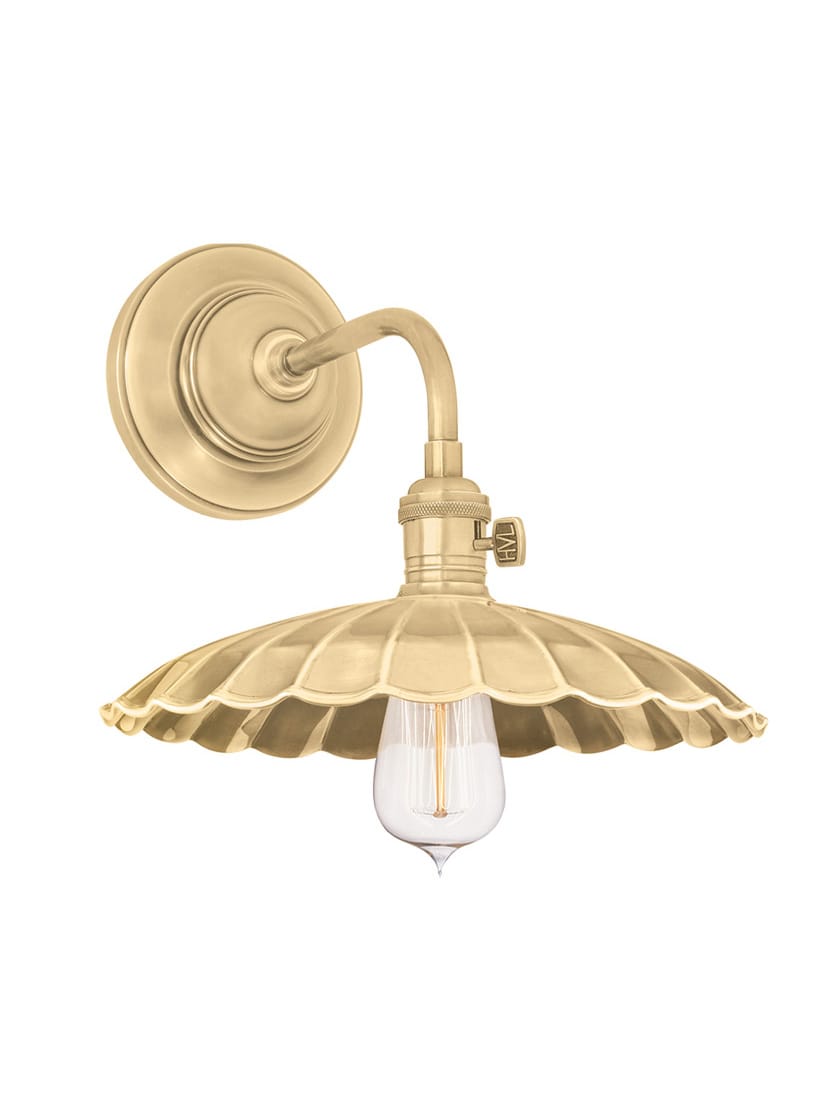Our Heirloom sconce's vintage charm begins with an early-electric socket holder cast to industrial standards. Details such as its broad scalloped metal shade and monogram paddle switch add distinction. The beautiful period finishes and industrial styling give it a unique look.