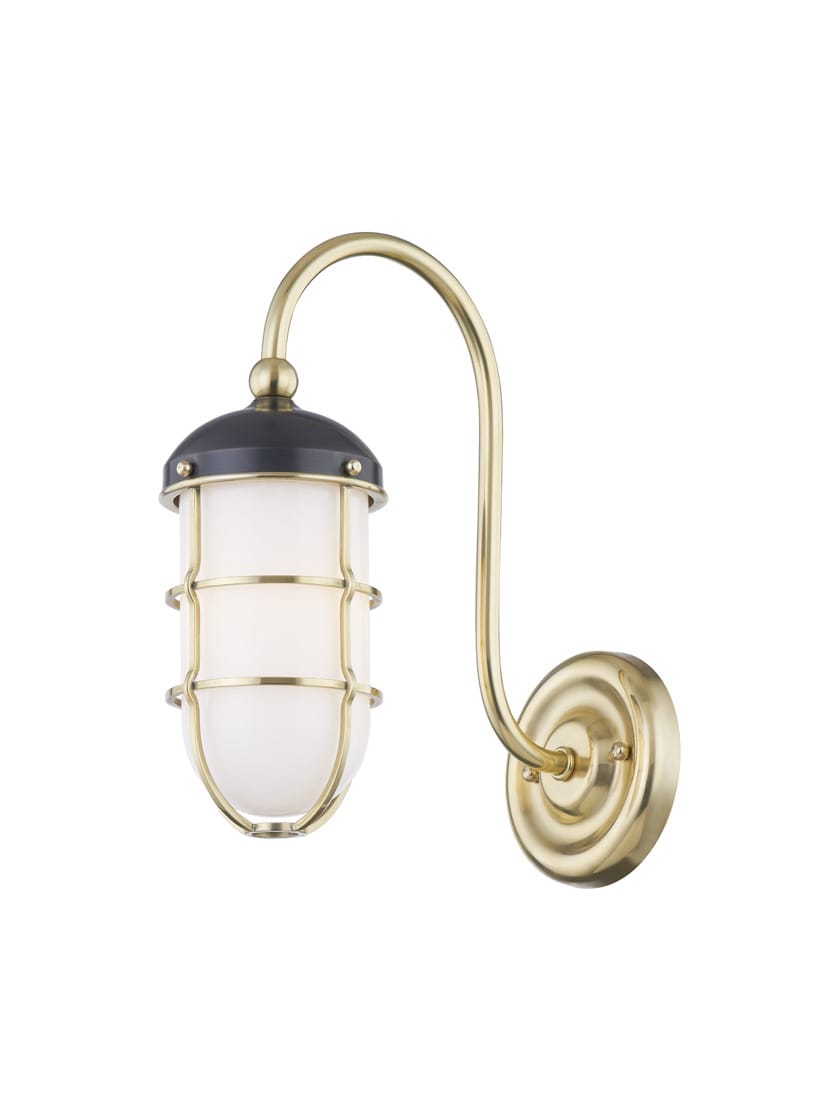 Gorgeous Aged Brass cagework and glossy opal glass give this recognizable silhouette an instant upgrade. The refined hardware and Off-White or Distressed Bronze finish options add to the Holkham sconce's elevated nautical aesthetic.