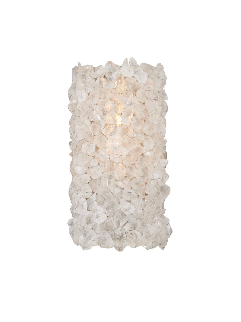 The Iconoclast Wall Sconce is a sparkling beauty with natural rock crystal affixed to a sturdy wrought iron frame in a contemporary silver leaf finish. Designed with attention to detail, this 1 light sconce features rock crystals attached with very thin wire, creating visual interest without interfering with the luminosity of the stones. The pieces of pale material filter the light in the same way ice might, enhancing the beauty of this fixture.