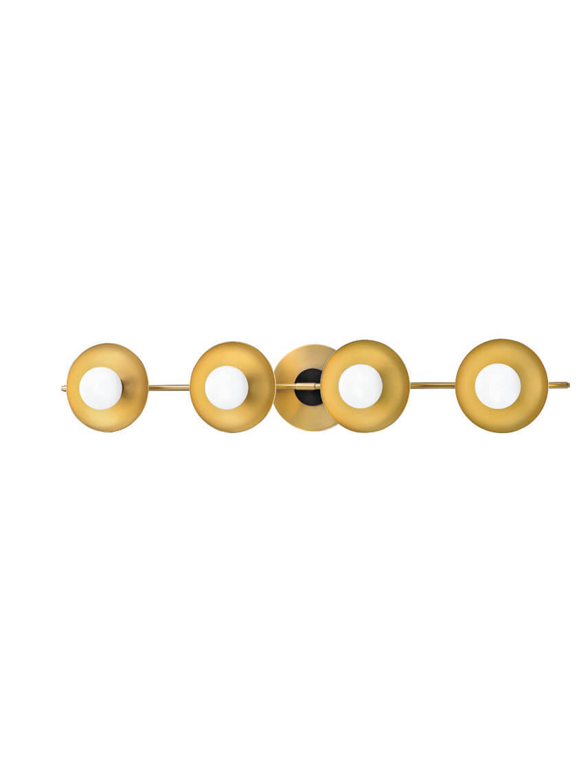 The Julien 4 light bathroom vanity sconce feels contemporary, with sculpted satellites set against a machined bar. Polished opal diffusers softly and evenly disperse its illuminance. Julien manages to feel at once mid-century modern and futuristic with its satellite shades and contrasting finishes of textured black and Aged Brass. Designed for energy efficient G9 bulbs it makes an attractive and environmentally conscious choice. Can be mounted in vertical or horizontal orientation.