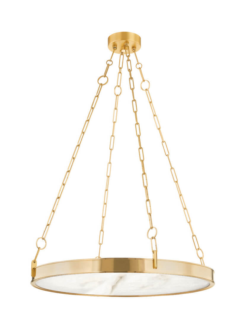 Kirby is a sleek and minimal drum-shaped pendant full of thoughtful detail. The alabaster diffuser is set within a metal frame featuring a subtle stepped edge and a perfectly designed bracket that connects the body to a beautiful paperclip chain link. This 30" pendant chandelier will add understated sophistication to any room.