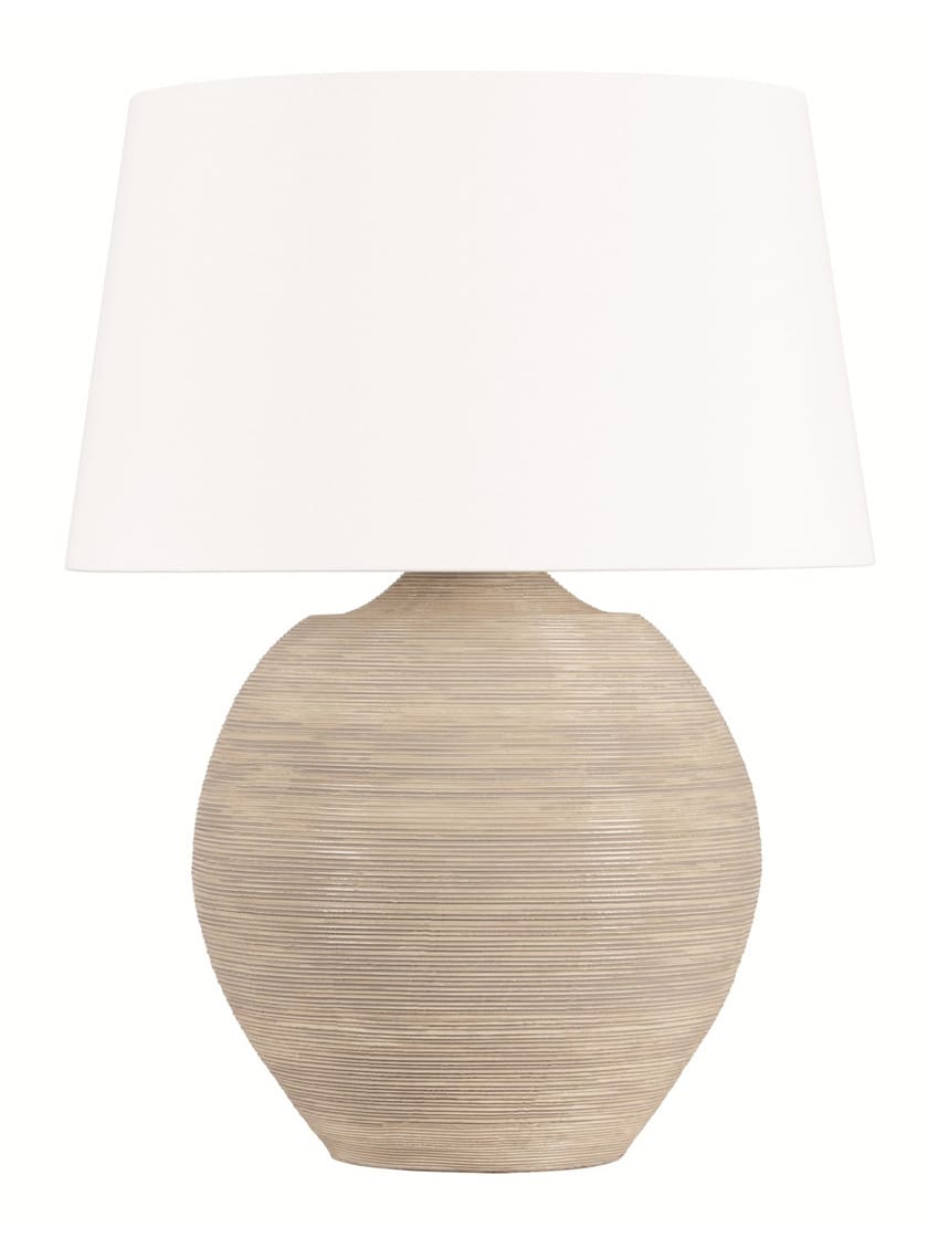 Resembling a found Greek or Roman antique, Kitchawan features a unique ceramic treatment similar to stucco that lends it a raw, organic appearance. Ethereal cloud-like patterns encircle the spherical lamp base, coordinating with the softly tapered white linen drum shade. Aged Brass hardware completes this soothing table lamp.