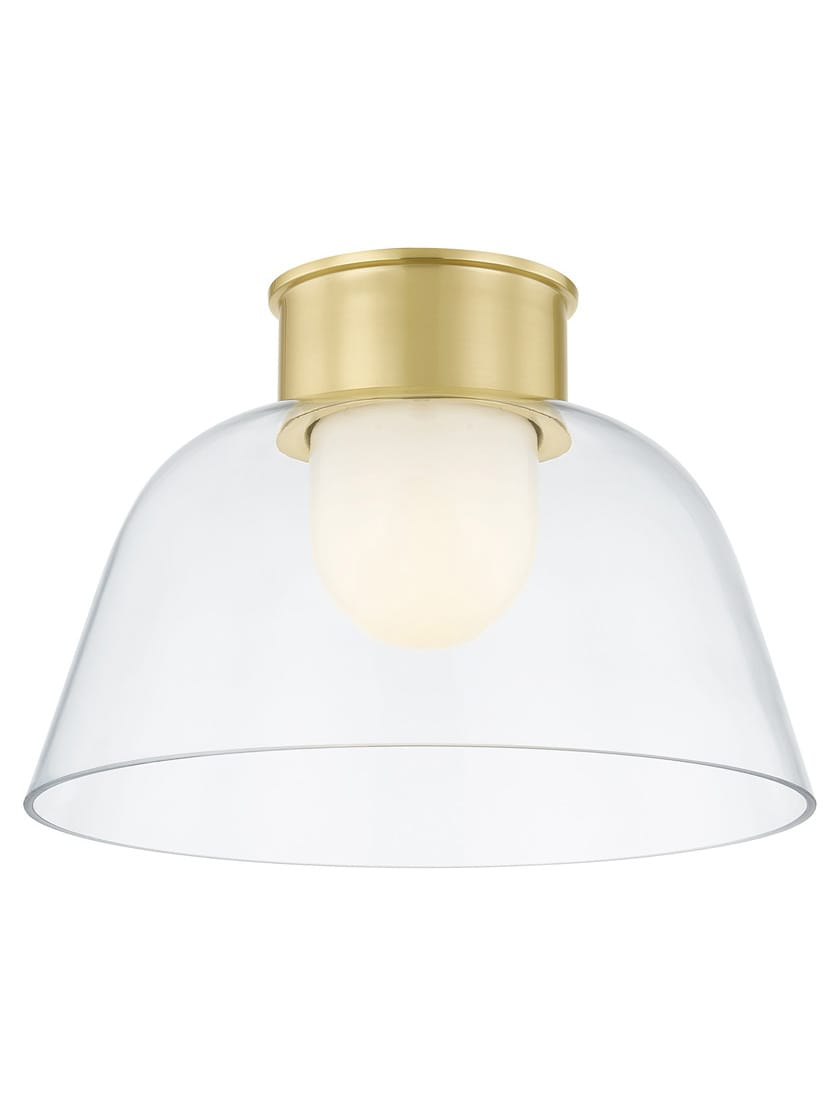 A celebration of the beauty of pared-down forms, our 14-inch Lakeside flush mount features a glossy opal inner diffuser surrounded by a clear glass outer layer. Shaped like a graceful bowl, this ceiling light forgoes ornamentation save for its extra-tall metal canopy. The streamlined metalwork with a vintage finish adds a decorative note to the minimalistic design.