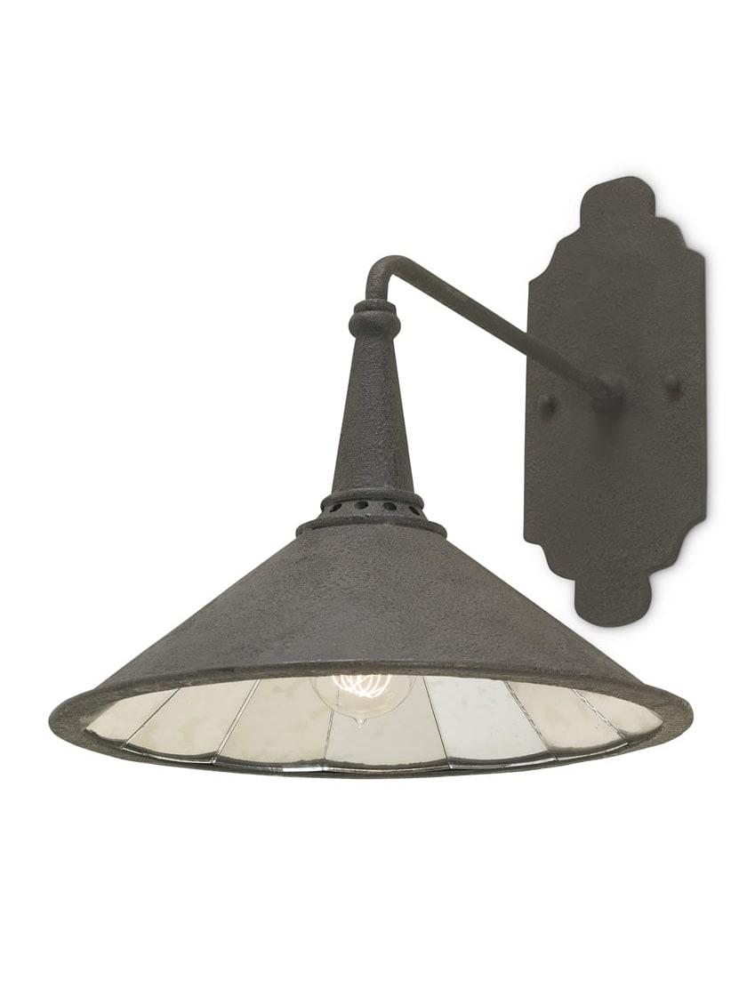 The Manuscript Wall Sconce is a contradiction in tones and styles. The Mole black finish on the exterior of the conical metal shade contrasts the slices of antiqued mirror fitted piece by piece inside the shade to create a luminous reflector. Subtly rustic and industrial, the antique mirror accent gives it a Victorian flair.