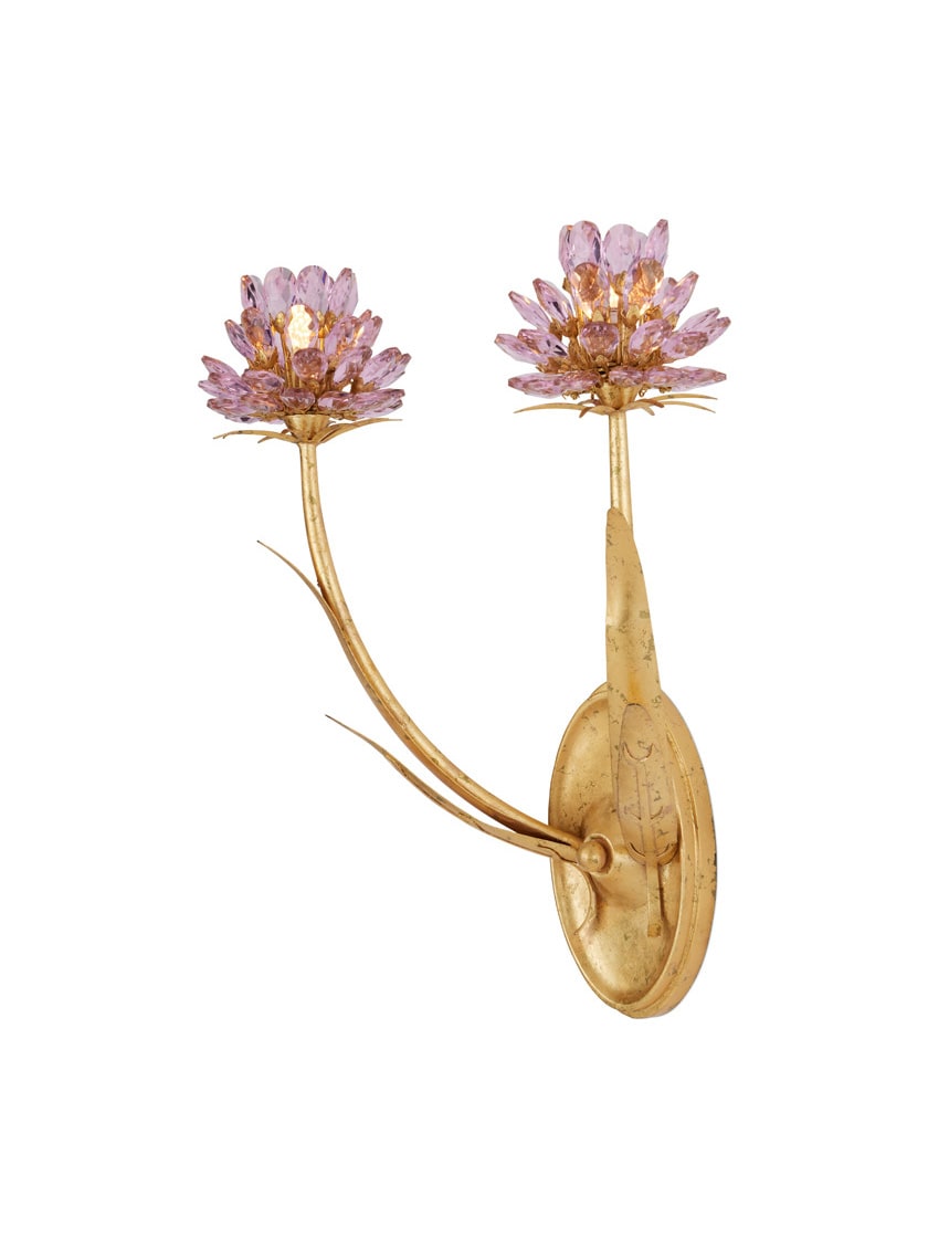 The Marilee Double-Light Wall Sconce is a luminous blend of elegance and whimsy. Finished in radiant Dutch Gold Leaf, its graceful metal stems curve upward, blooming with faceted pink crystal blossoms that catch and reflect the light. Each bulb is nestled within the sparkling glass, enhancing the natural shimmer of the crystals and creating a soft, effervescent glow.