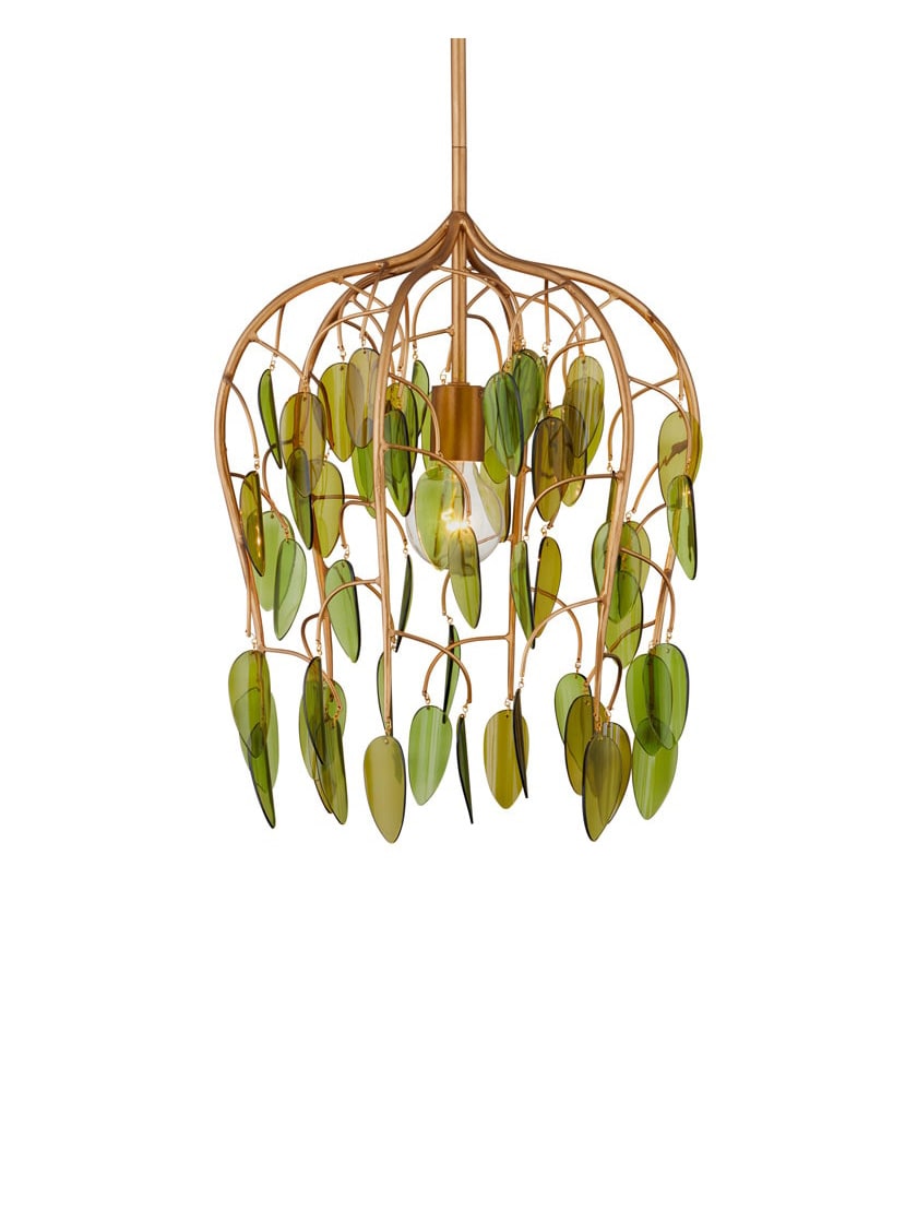 As lovely as a dangling blossom that calls to mind a balmy evening, the Midsummer Pendant blooms with artistry. A wrought iron frame with an agd brass finish that tapers from a clean-lined rod to thin tendrils as it graduates toward the bottom dangles curved petals made of recycled glass. The green and amber pieces retain the original colors of the beverage bottles from which they were taken. Because this fixture is artisanal, the configuration of the glass colors will vary slightly, which makes each green and gold pendant unique.