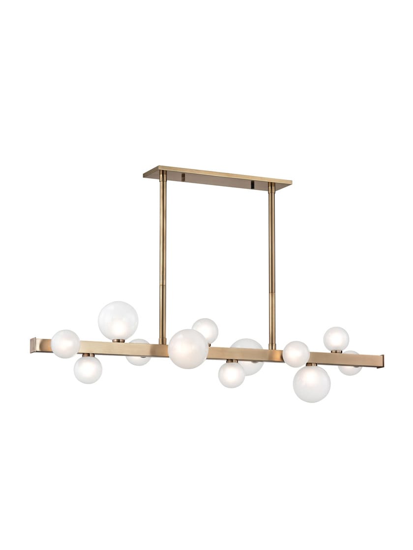 Orbs of light, made of etched glass, float effortlessly like bubbles clinging to the square metal bar of this delightful linear island chandelier. The result is a pleasing diffusion of light. Mini-Hinsdale makes an artistic statement in any space it adorns, while adding a subtle sense of playfulness.