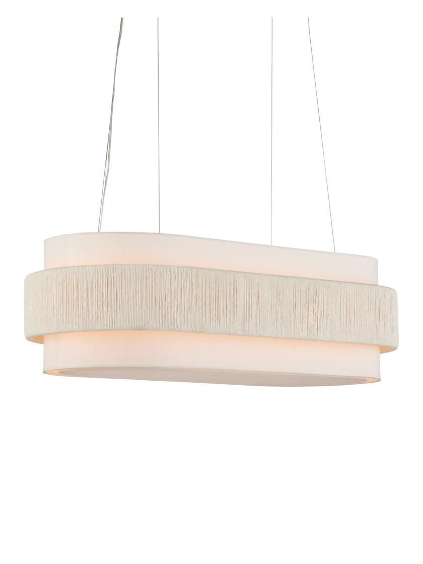 With a band made from recycled paper that has been twisted like braided hair, the Monreale Oval Chandelier has an ultra-contemporary cleanness to its design. The paper, which is painted white, is wrapped around the middle of an off-white shantung shade. The canopy is finished in a Sugar White that contributes to the lightness of this white chandelier. The bottom of the shade is fitted with a diffuser to soften the glow.