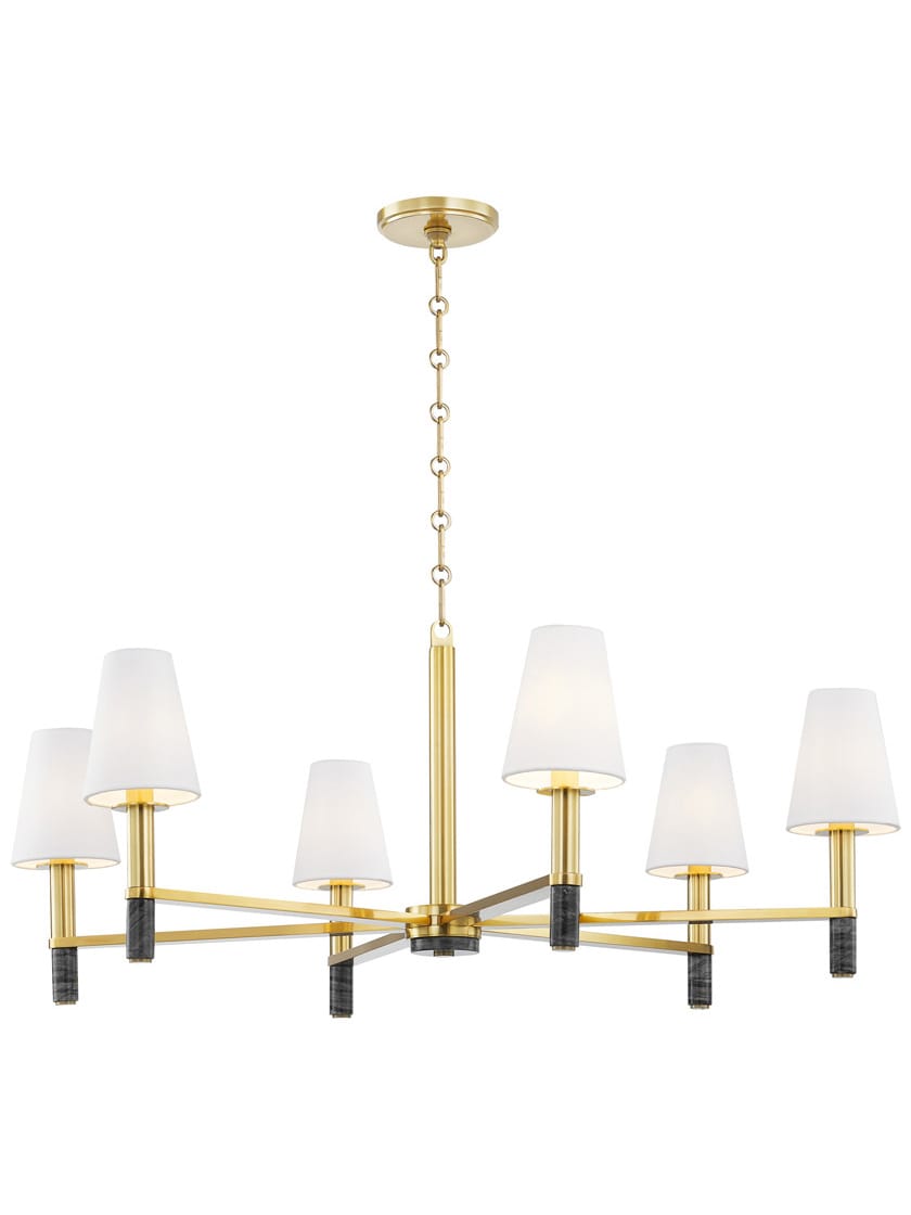 Merging past and present, this impressive Montreal 6 light chandelier features contemporary clean lines and the striking appeal of Nero Modera marble. Topped with tapered white linen shades, the metal candlesticks are elongated downwards by natural stone columns. Complemented by a warm Aged Brass finish, Montreal embodies understated luxury.