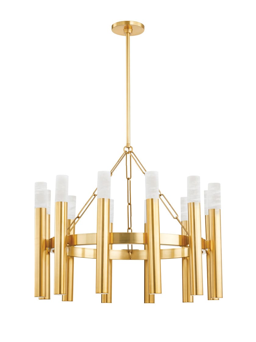 A modern take on a candelabra chandelier, Pali harnesses clean line symmetry to strike a note of grandeur. It features candle sleeves cast from Aged Brass, capped by natural alabaster. When lit, the alabaster emits a reverential glow that fills the room.