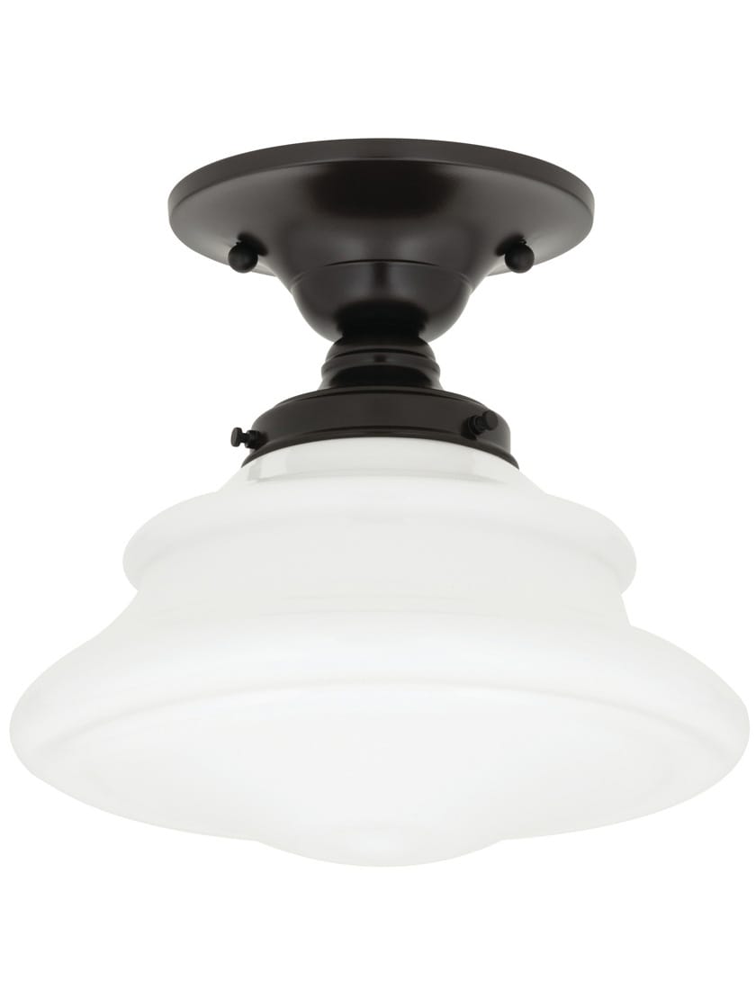 Evoking vintage schoolhouse glass, this small Petersburg ceiling light features a mouth-blown glossy opal diffuser. To create this elaborate shape, a skilled artisan works molten glass into a special form called a “paced mold,” which is simultaneously turned by an assistant. With careful timing, the team produces a seamless piece of beautifully detailed glasswork.