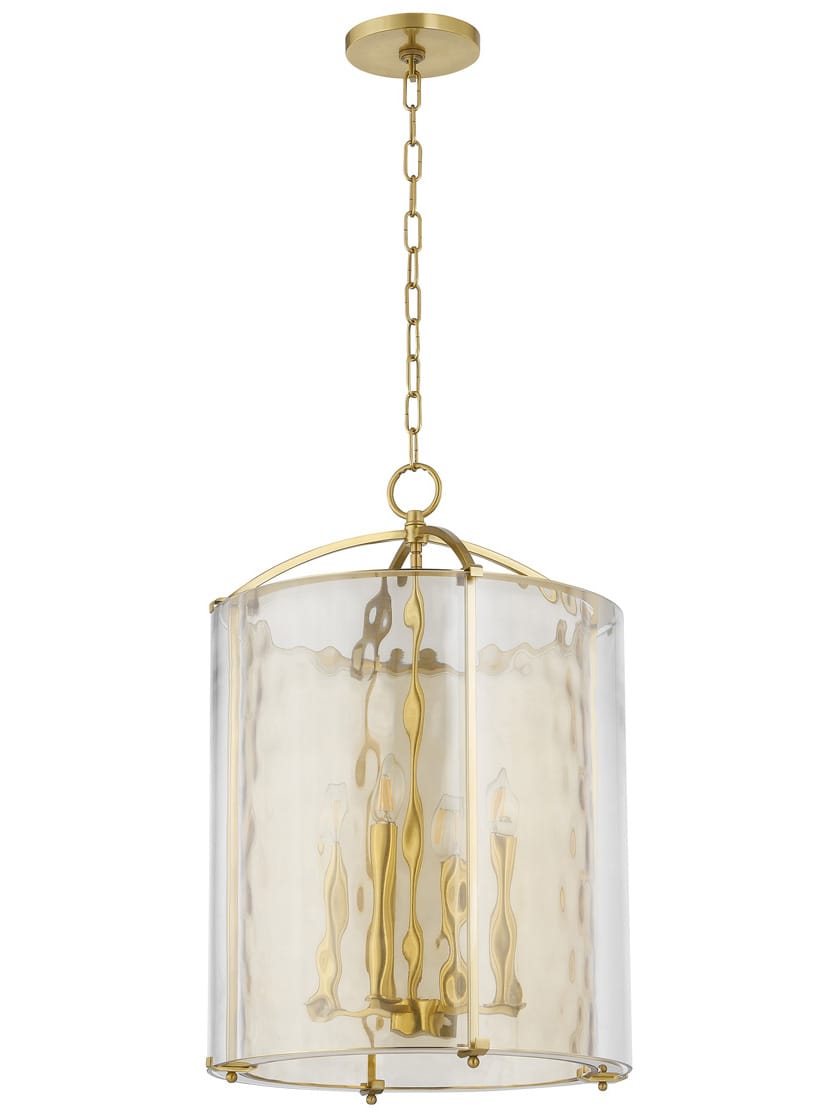 Our dynamic Ramsey lantern style chandelier, resembling the fluidity of flowing water, features a light champagne glass cylinder nested inside a clear water glass shade. As the unique glass surfaces gently obscure and filter light, they glow brilliantly from within. The Aged Brass framework and chain create a warm finishing touch to this impressive pendant fixture.