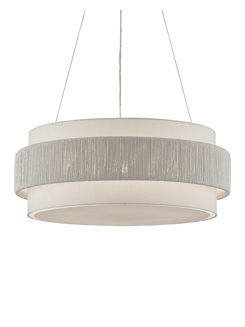 Our Rousham Chandelier has an unusual accent on its fabric shade created by the twine panel made from recycled paper that is twisted and tightly wrapped around a metal frame. The panel made from the sustainable material, which is affixed to the center of the shade, is then coated with a sealant to protect it from moisture. The beige chandelier is suspended with aircraft cable and has a sugar white finish on the interior of the shade, which brightens the light.