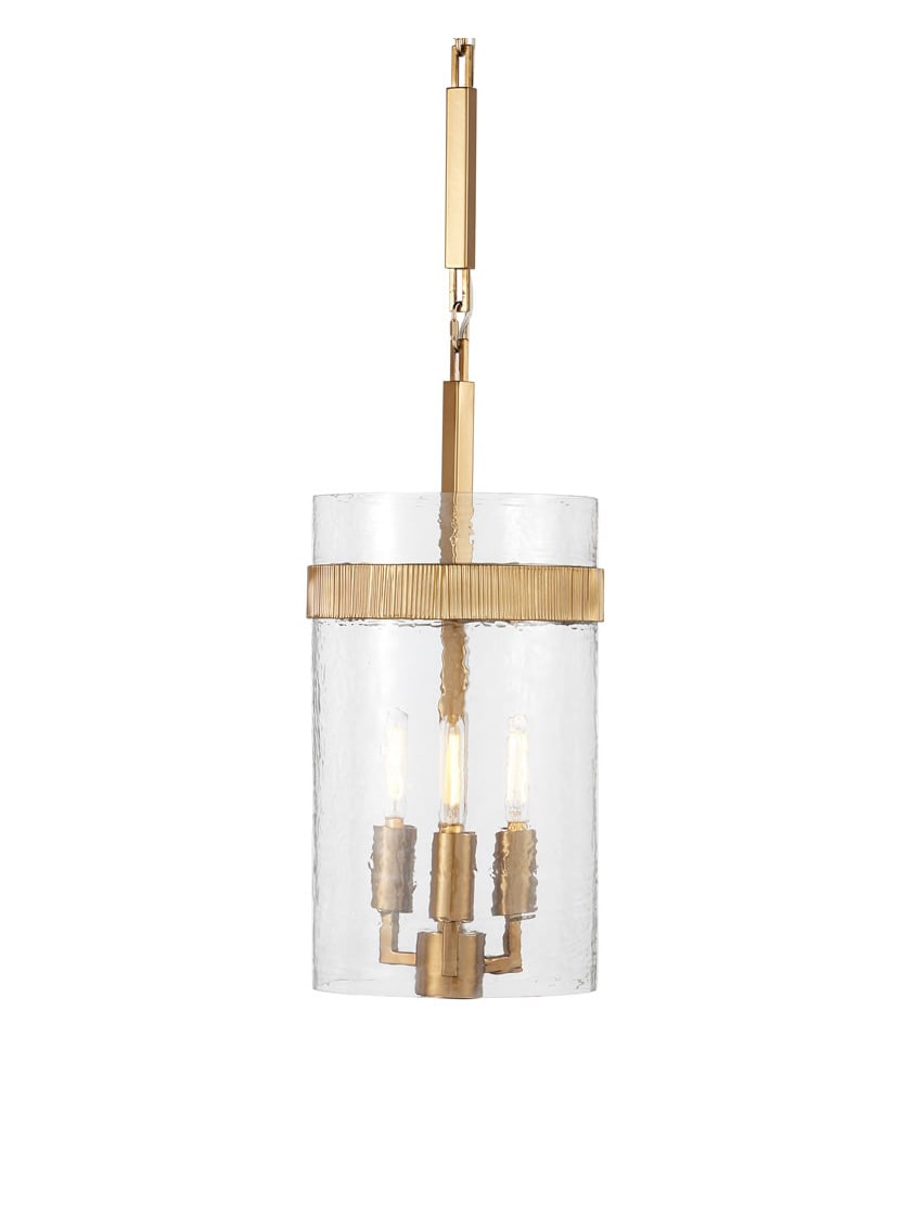 Our Sudeley Lantern Pendant features a 9.5" diameter cylindrical shade made of thick hammered glass that gives the piece both weight and texture. The glass is secured by a reeded iron band in a satin brass finish, adding a refined accent. Its hanging hardware has clean, square edges that emphasize a modern profile, while the substantial glass shade diffuses the light with a soft, dappled glow. With 3 bulbs it provides considerable light for its small size.
