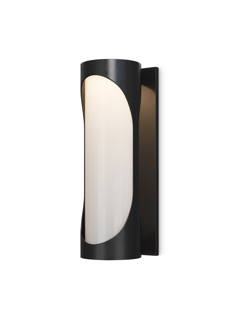 The Swale Large 27" Outdoor Wall Sconce has a graphic cylindrical silhouette with large oval cut outs where illumination can escape. Through the cutouts in the black metal frame, a milky white glass cylinder illuminates uniformly when the integrated LEDs shine through it. The metal is powdercoated to make this outdoor sconce weather worthy.