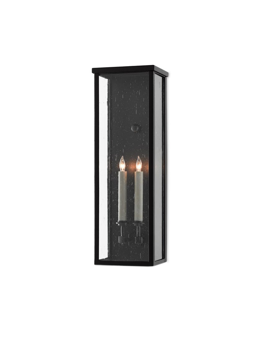 The Tanzy 2 Light Medium Outdoor Wall Sconce, a modern take on colonial lighting, features shapely stems holding its two tall candles and bulbs, surrounded by three panes of seedy glass. The black wrought iron sheet metal frame in a midnight finish is a high-performance, Trilux finish that is weather-resistant against fading, cracking and rusting.