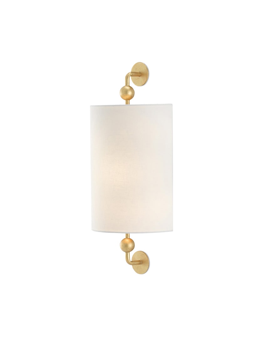 Tiny globes ornament the arms that affix the half cylinder off-white linen shade to the hidden backplate of the Tavey Gold 1 Light Wall Sconce. Made of wrought iron in a contemporary gold leaf finish, this stylish sconce meets ADA requirements.