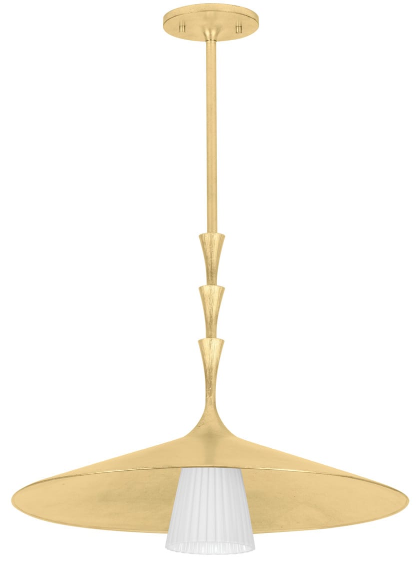 Nature meets geometry in the elevated Vails Gate. This unique pendant features a repetitious stack of flared trumpet forms, reminiscent of the nodes on a flower stem. Fluting details on its glossy opal glass shade add depth to the symmetrical design, nodding to its organic origins. The textured surface, finished in Vintage Gold Leaf, contrasts beautifully with the white glass shade.