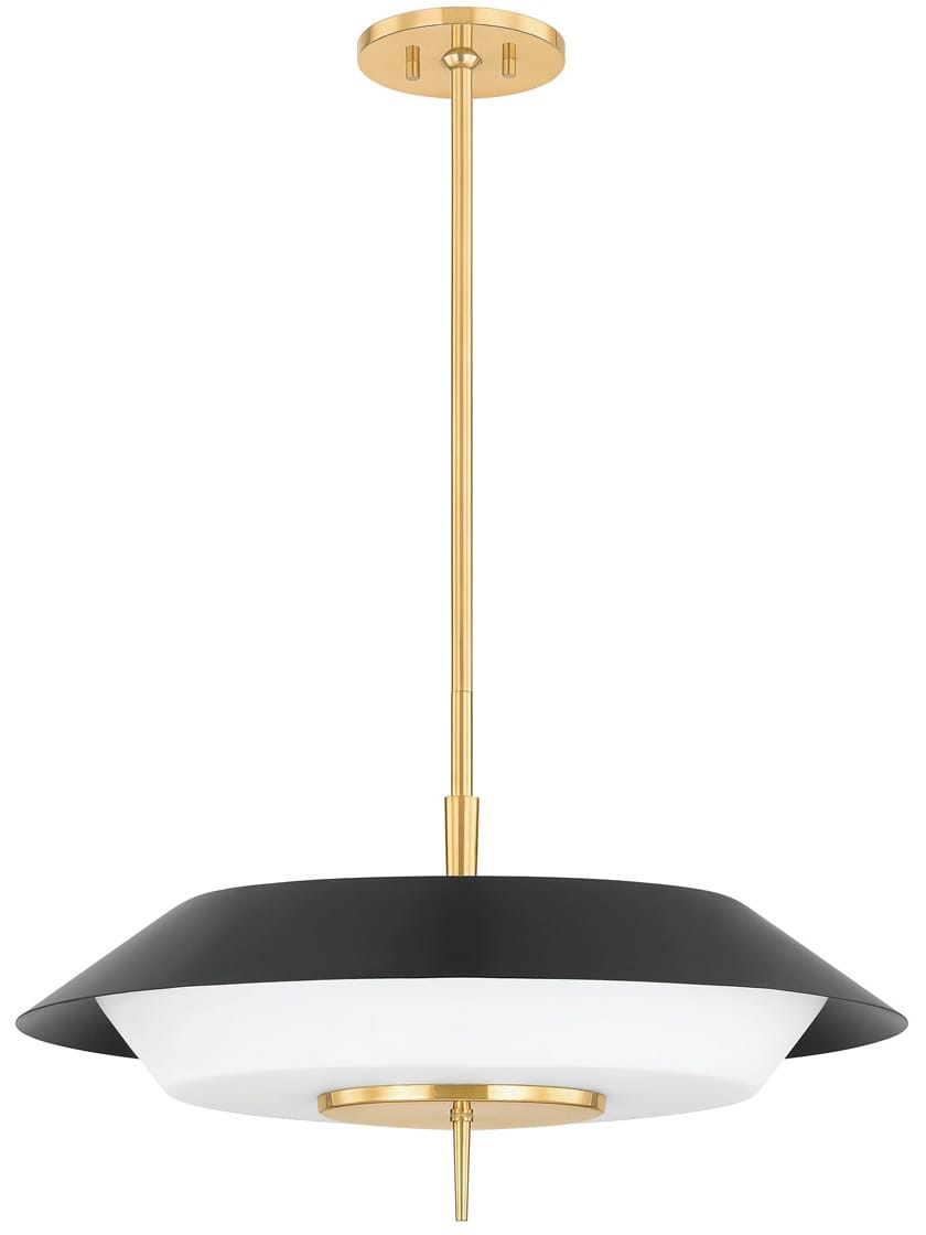 A tapering matte opal glass shade, flattened on the bottom and capped with conical black metal, make up the streamlined saucer shape of Westport. Its thin discs and spire, finished in Aged Brass, complete the retro-futurist style of this sleek Mid-Century pendant.