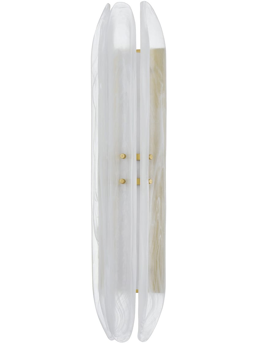 Elevating a minimalist silhouette, the Westtown sconce uses exquisite materiality to create a subtle statement. Secured with small thumbscrews, long pieces of piastre glass are positioned before a glowing LED light, emanating from its tall Aged Brass backplate. Internally etched with a white swirl pattern, the glass creates a soft light diffusion, perfect for a hallway or bathroom.