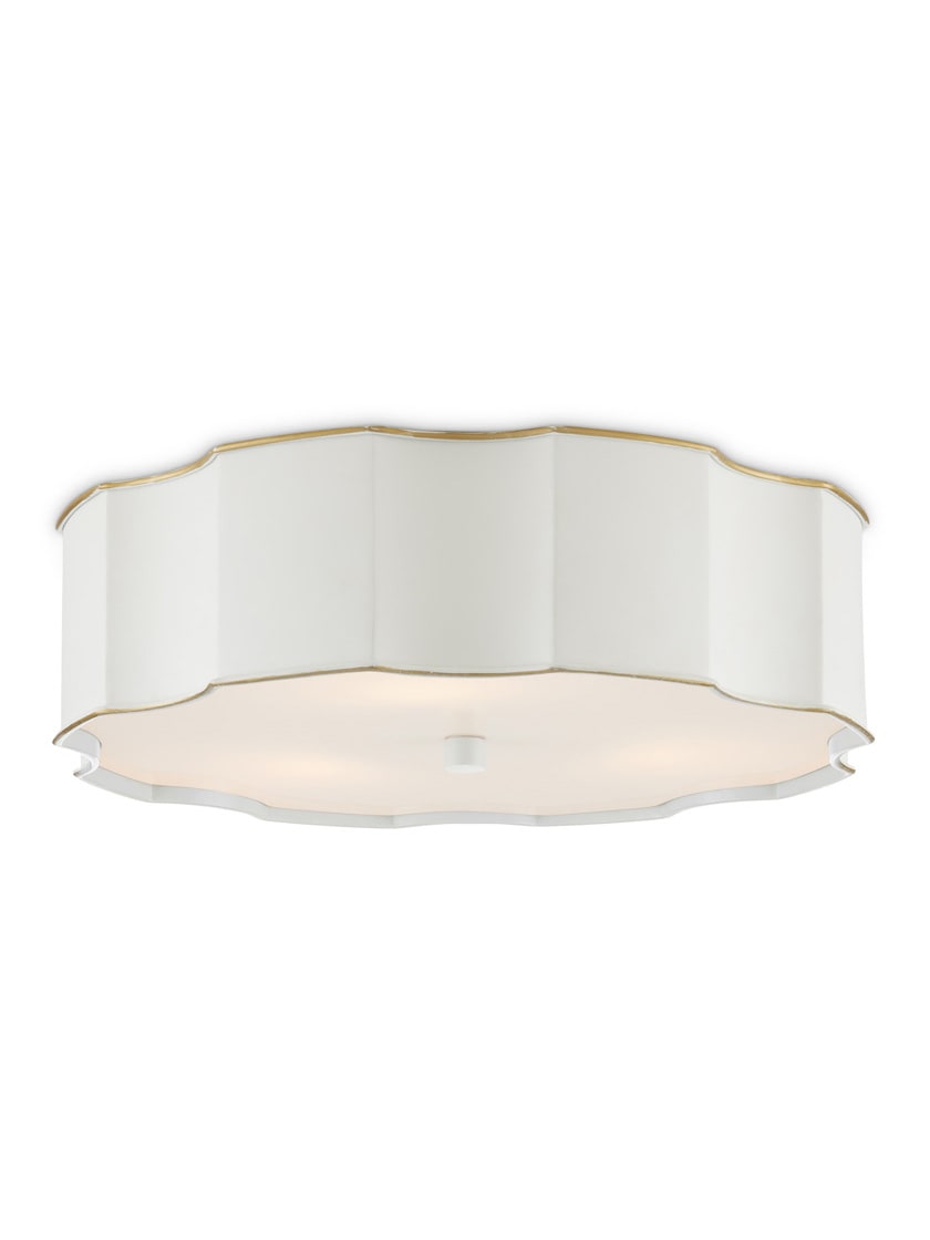 The Wexford White Flush Mount's snow white finish and fine gold trim are reminiscent of fine china. The paleness of the surface works in concert with the soft glow produced by the opaque acrylic diffuser to create a luminous design. The matching finial that fastens the diffuser to the fixture and the scalloped shape of its profile are graceful elements. Healthily sized at almost 20" and with three lights, the Wexford will suit many interior spaces from bedrooms and hallways to kitchens.