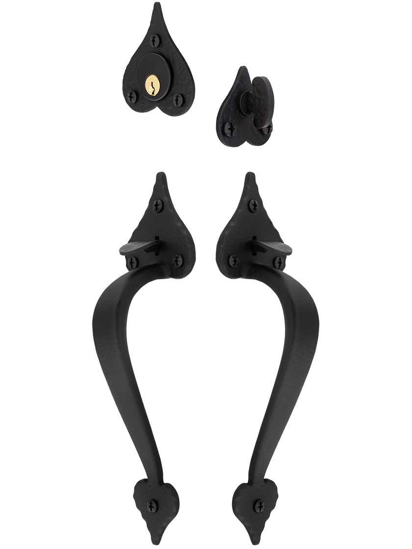 At once charming and rugged, this heart-design entry set is the finishing touch for your Colonial or country-style home. You get the look of a hand-wrought rim-latch with the security of a modern mortise lock. Constructed of heavy-duty forged iron, its surface is phosphate treated then lacquered, for rust-resistant, long-lasting wear.