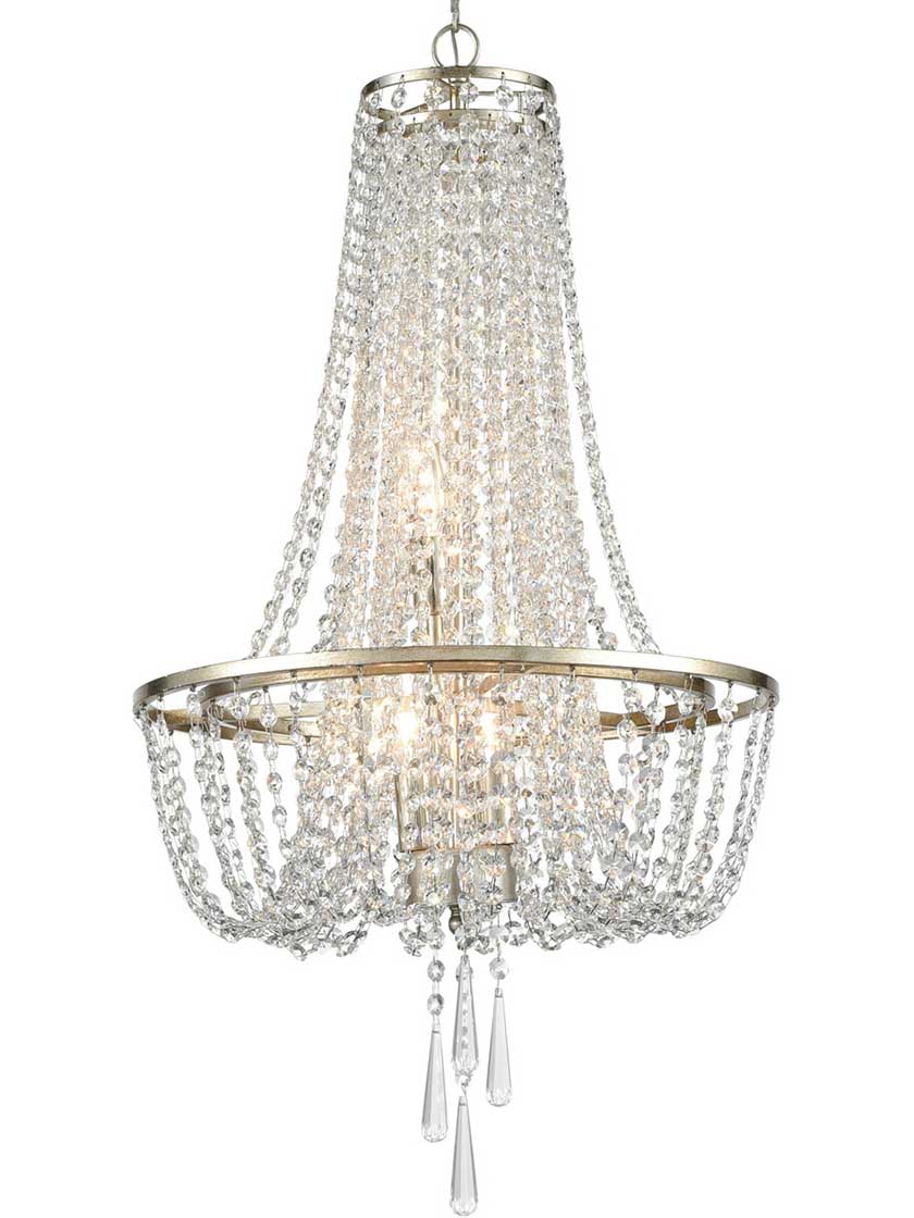 The Arcadia 4-light chandelier is truly splendid. Strands of crystal reminiscent of Roaring 20s flapper beads gracefully drape from an elegant empire style frame. The antique finish has a subtle texture that contrasts nicely against the brilliant glass. This stunning light captures the timeless feel of early-20th-century prosperity and luxe, and will add glamour to a foyer, great room or dining room.