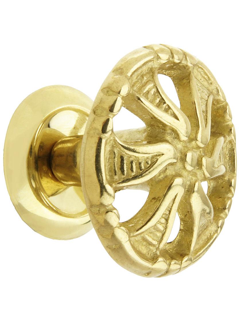 Decorative, yet light-hearted, this pinwheel pull is a lovely addition to any cabinet or piece of furniture. The delicate pierced design is recast in solid brass from a Victorian original. It includes a plain stamped brass rosette (removable), which effectively covers marks or holes from previous pulls. The brass is left unlacquered and will gradually develop a wonderful antique patina.