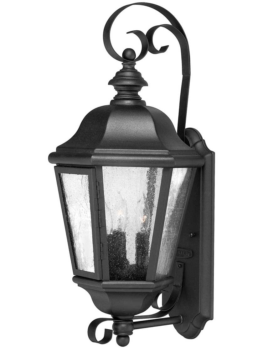 The Edgewater Tall 10-Inch Outdoor Wall Sconce brings a distinguished look to your home's exterior. This traditional design features an enchanting pagoda style roof, clear seedy glass and decorative scrolls. Thanks to its hinged door, changing the bulbs is quick and easy. Crafted from durable, weather-resistant cast aluminum, it comes in your choice of two popular finish options, perfectly suited to Georgian, Federal and Neo-Classical homes.