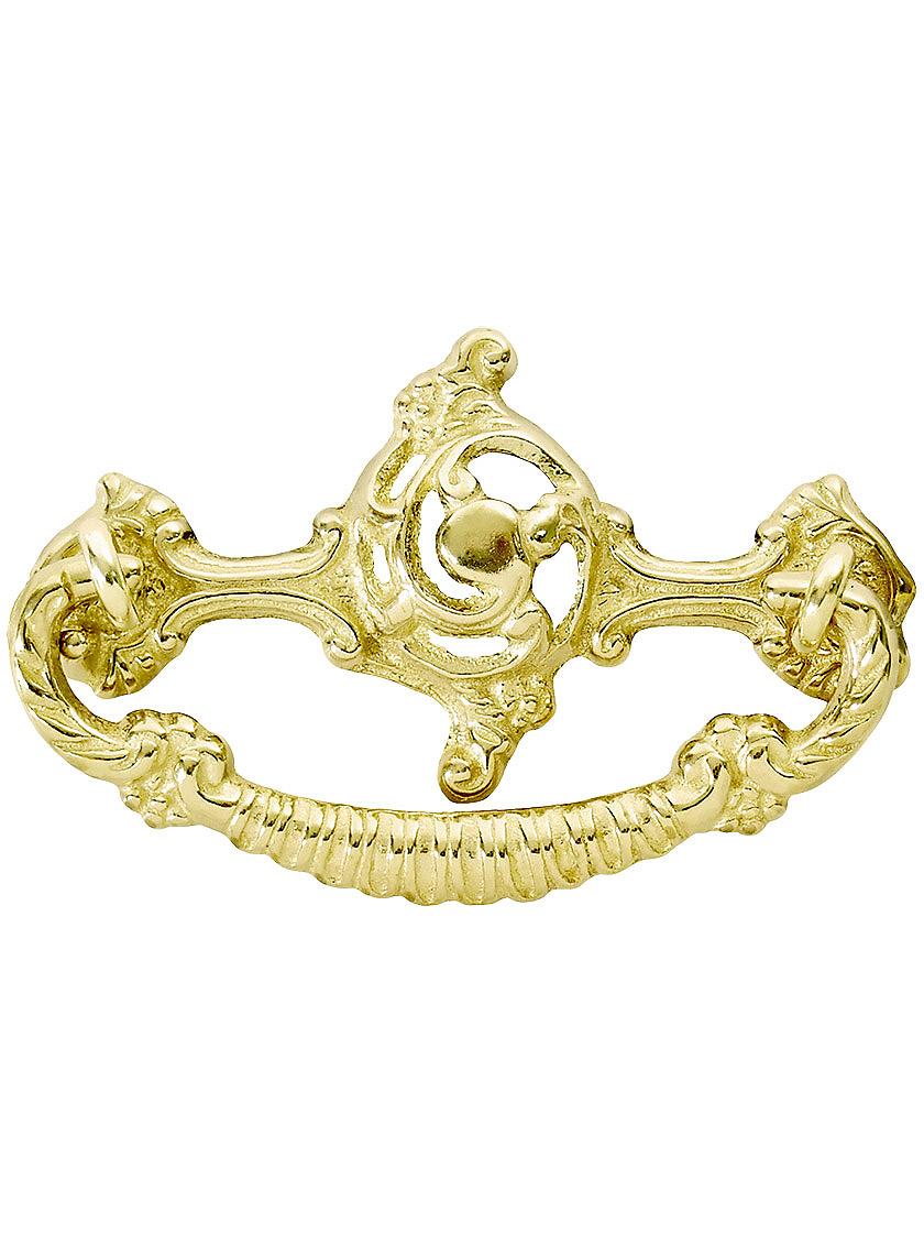 Smartly outfit your furniture with this Rococo-style decorative bail pull. Manufactured like the originals in heavy, cast brass, the ornately decorated back plate and handle will stand up to years of use. It's ideal for a china closet, chest, or desk drawers. The polished, unlacquered finish is meant to age gracefully over time, just like the antique originals.