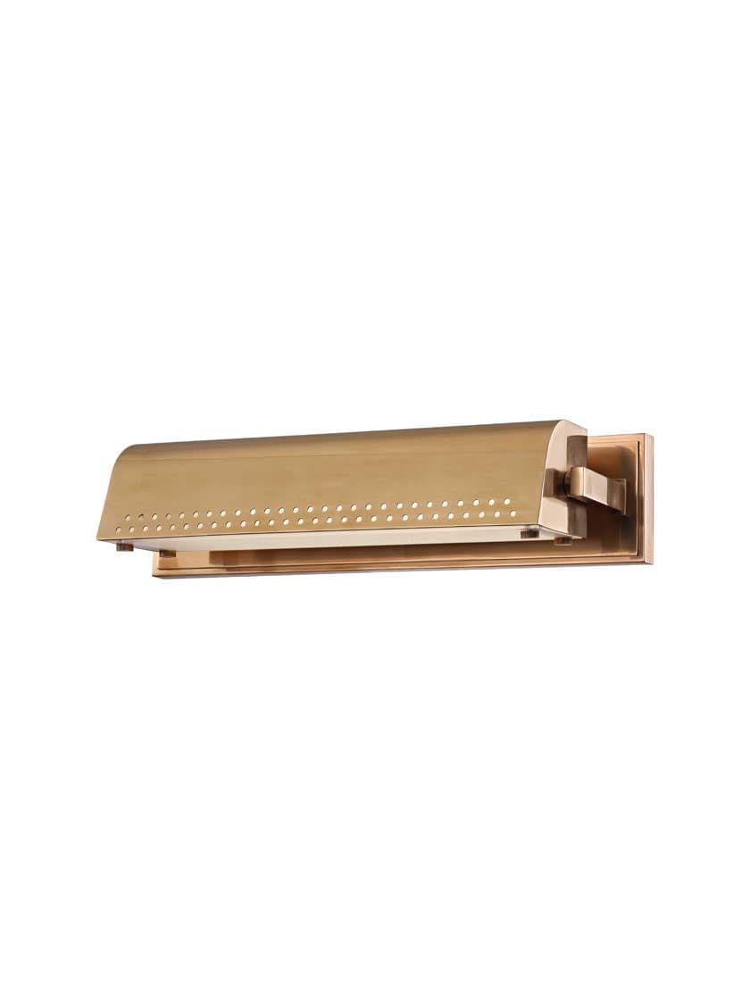 The Garfield Led picture-light has an industrial-chic quality defined by its perforated-metal shade. Stylish and low-key, this fixture will accentuate and not distract from what’s being displayed. Also works well over bookshelves.